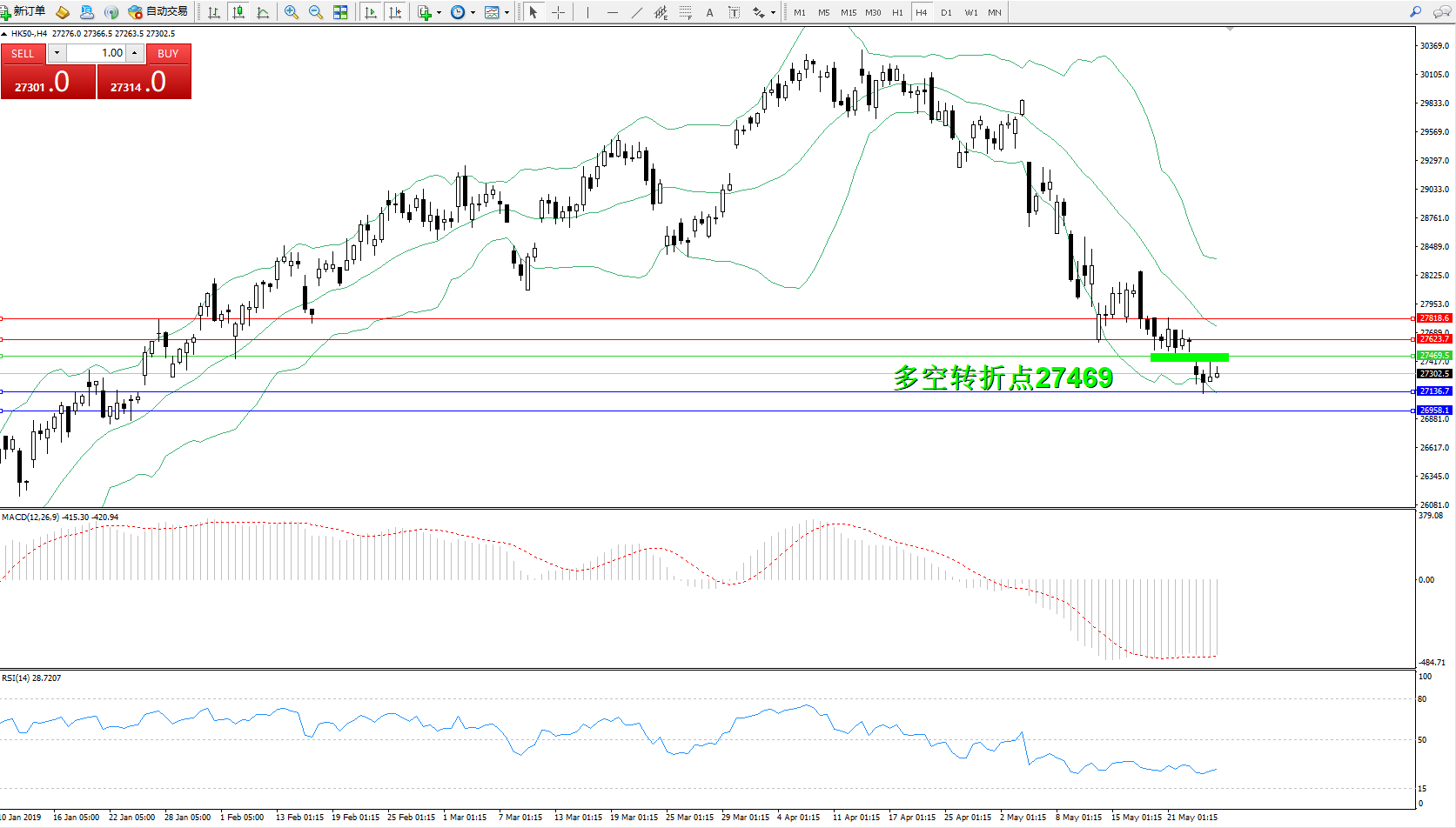 交易策略:27469下方看跌,目标27136、26958