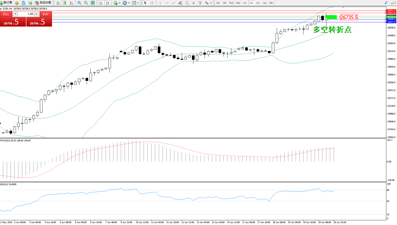 道琼斯指数DJ30—— 4小时K线图显示:
