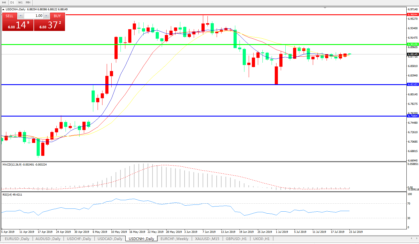 交易策略: 在6.9010之下,看跌,目标价位为6.8210,然后为6.7580。