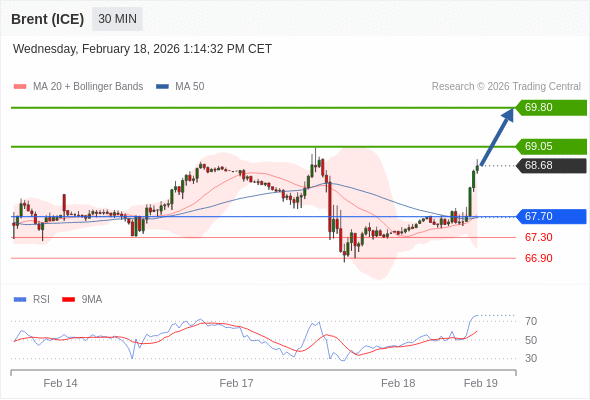 在 67.70 之上,看涨,目标价位为 69.05 ,然后为 69.80 。