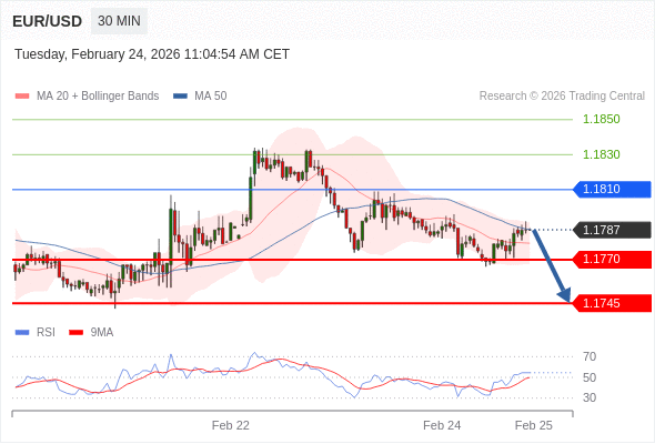欧元/美元 当日内: 短期关键阻力位在1.1810。