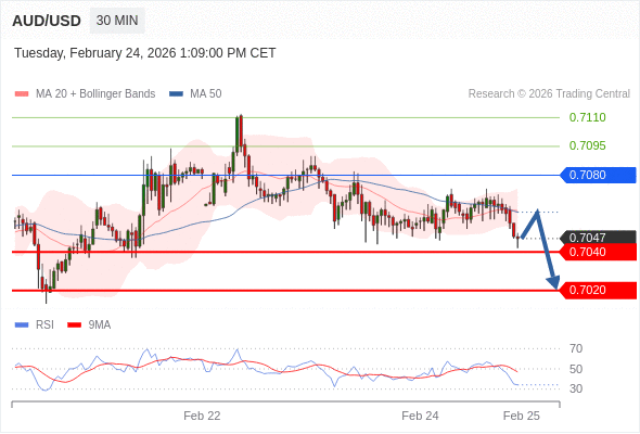 交易策略: 在 0.7080 之下,看跌,目标价位为 0.7040 ,然后为 0.7020 。
