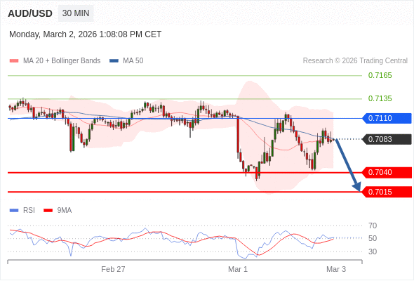 交易策略: 在 0.7110 之下,看跌,目标价位为 0.7040 ,然后为 0.7015 。