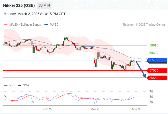 在 57790 之下,看跌,目标价位为 57050 ,然后为 56540 。