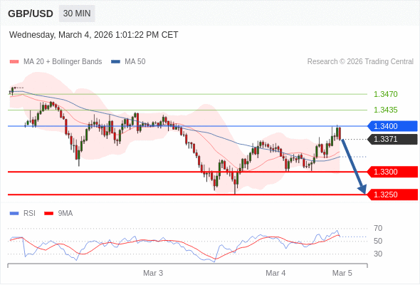 交易策略: 在 1.3400 之下,看跌,目标价位为 1.3300 ,然后为 1.3250 。