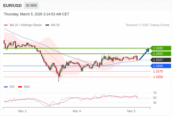 在 1.1600 之上,看涨,目标价位为 1.1655 ,然后为 1.1680 。