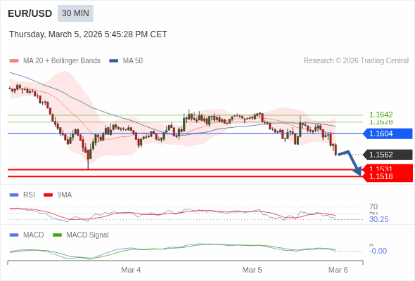欧元/美元 当日内 : 看跌,在 1.1604 之下。