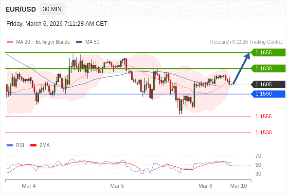 在 1.1590 之上,看涨,目标价位为 1.1630 ,然后为 1.1655 。