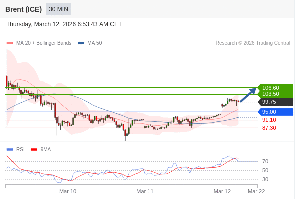 布伦特原油 (ICE) (K6) 当日内: 在95.00之上,看涨。