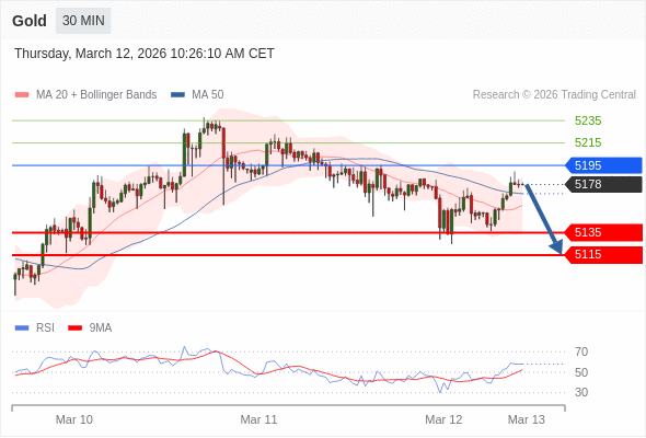 黄金现货 当日内: 短期关键阻力位在5195。