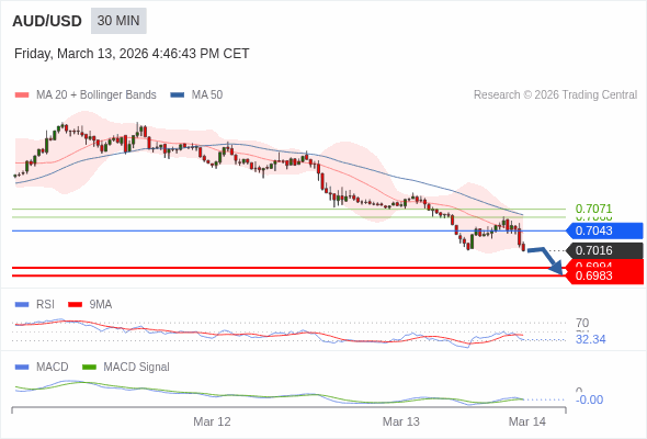 澳元/美元 当日内 : 看跌,在 0.7043 之下。