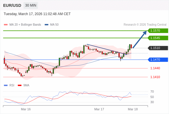 在 1.1470 之上,看涨,目标价位为 1.1545 ,然后为 1.1570 。