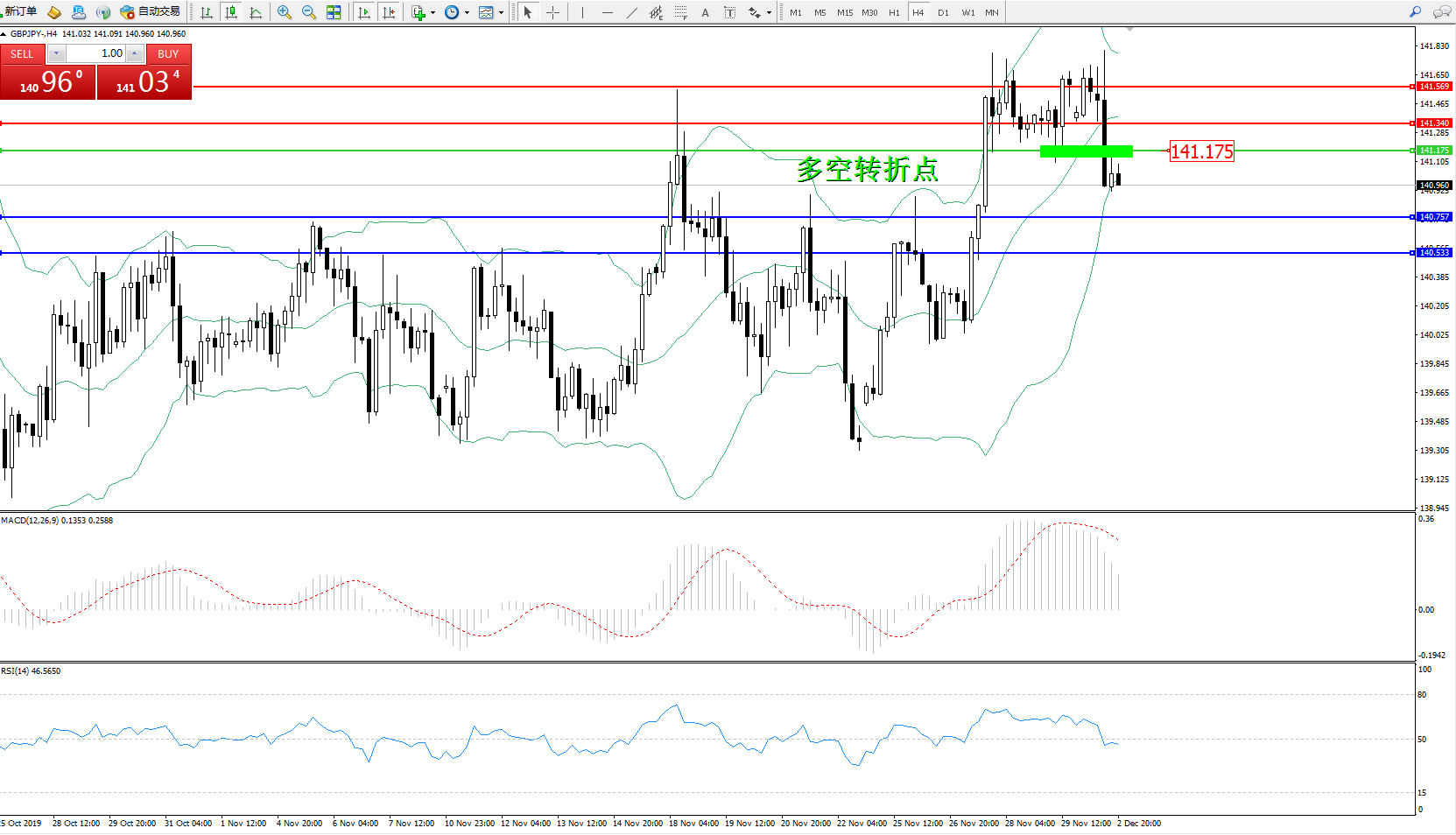 交易策略:141.175下方看跌,目标140.757140.533