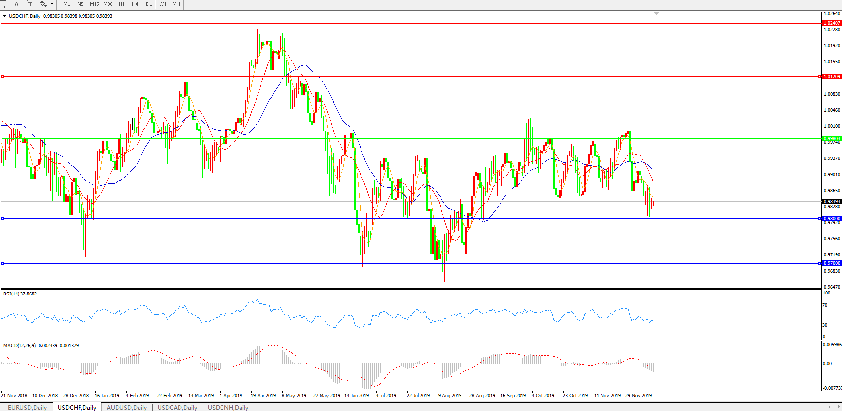 技术面简析:日线图均线呈有序空头排列,汇价剧烈震荡持稳于0.98关口上方,MACD运行于0轴下方且量能0轴下持续放量,RSI震荡走低,预计汇价存进一步下行空间。