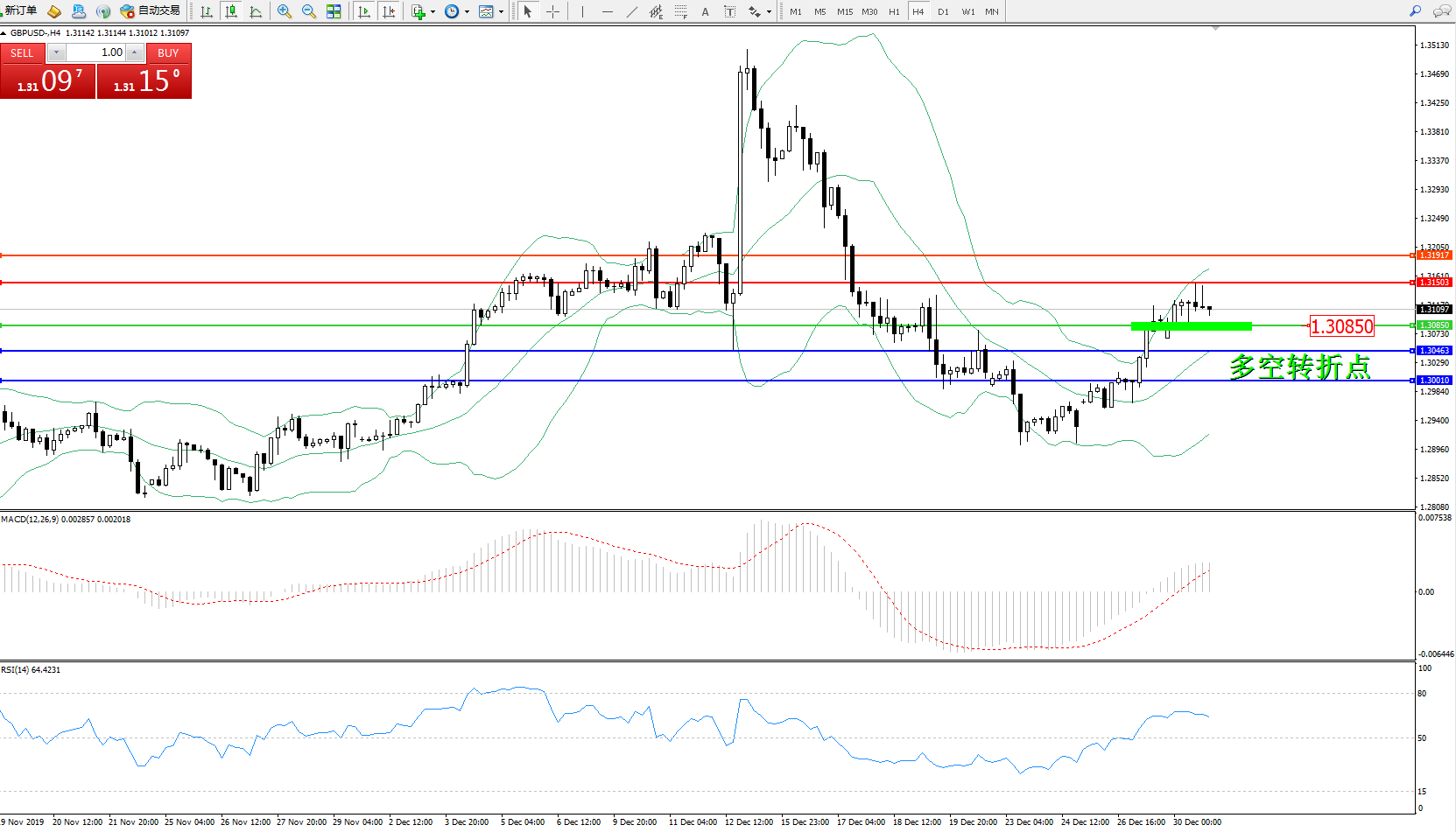 交易策略:1.30850上方看涨,目标1.31503、1.31917