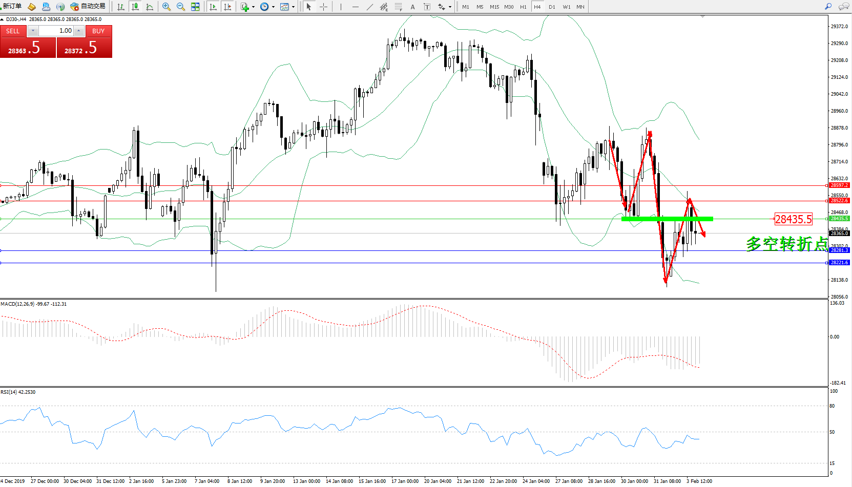 道琼斯指数DJ30—— 4小时K线图显示: