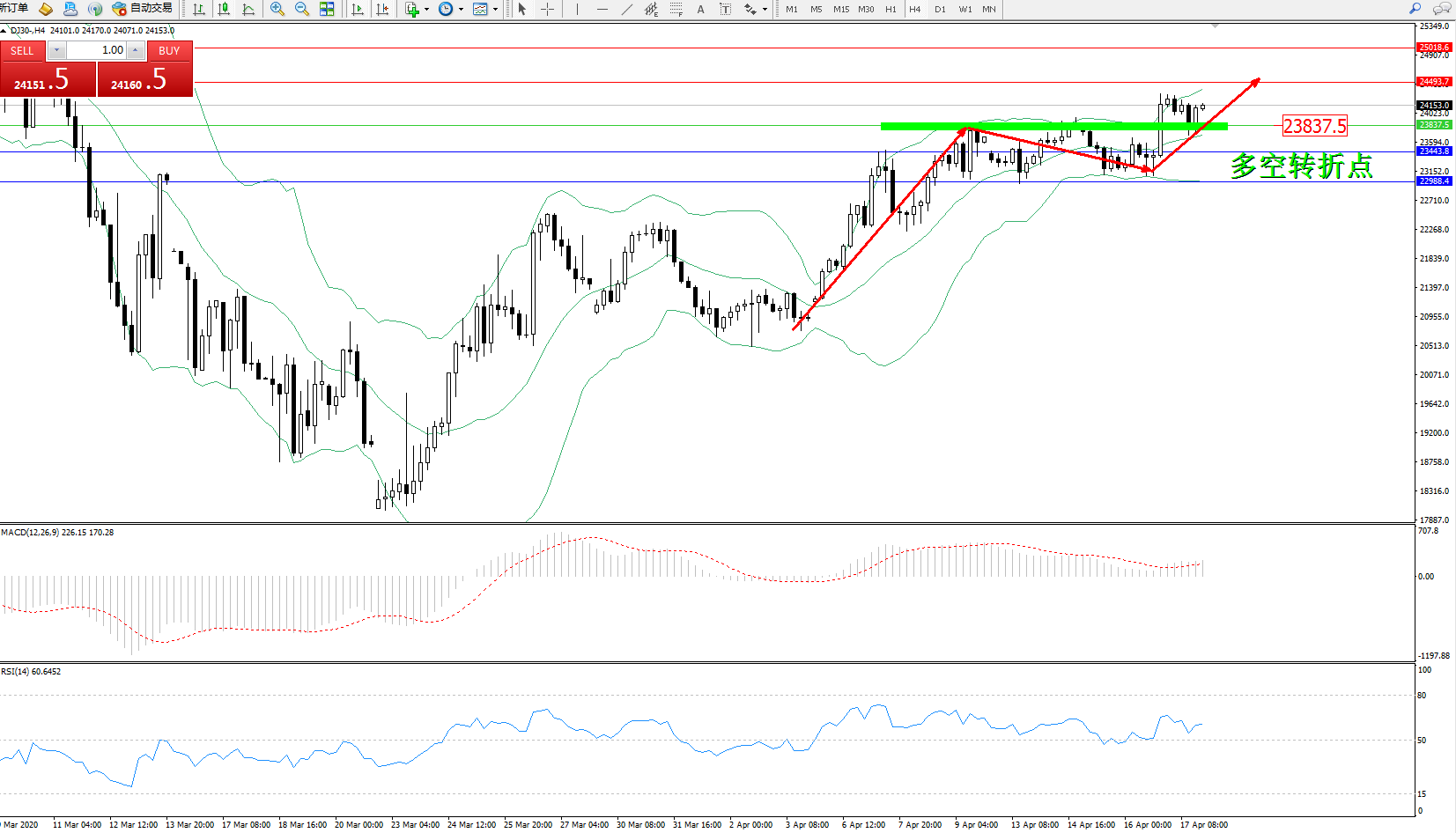 道琼斯指数417日(周五)收盘上涨704.80点,涨幅2.99%,报24242.49点。美国股市周五扩大本周涨幅,因投资者揣测美国经济不久将逐渐摆脱防疫封锁,并且由于寻找冠状病毒治疗方法的进程中出现了一线希望。场外有大量资金在观望,投资者渴望投入资金参与反弹。有关美国经济可能分阶段重新开放的前景和有关新冠药物可能有效的报道刺激市场乐观情绪;投资者对一项抗病毒药物的试验结果和美国总统特朗普重启经济计划持谨慎乐观态度,风险意愿有所回暖。美国10年期国债收益率升2个基点至0.65%,之前美联储放慢国债购买步伐。