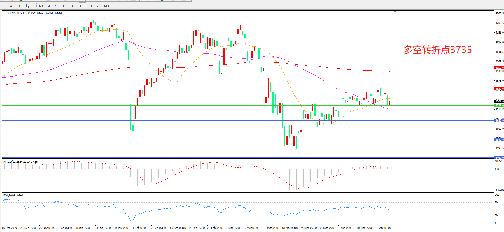 4小时图看,沪深300延续区间震荡,整体波幅不大,3735成为短期多空分水岭,均线系统走平,MACD红柱增加,RSI指标向上,日内延续上行概率较大。