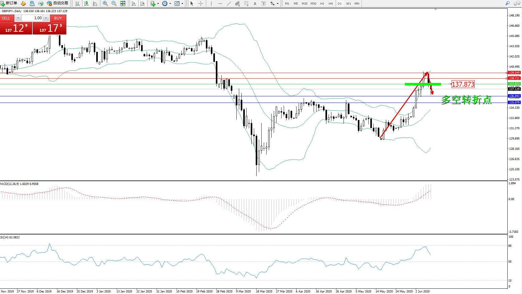 交易策略:137.873下方看跌,目标136.043135.079
