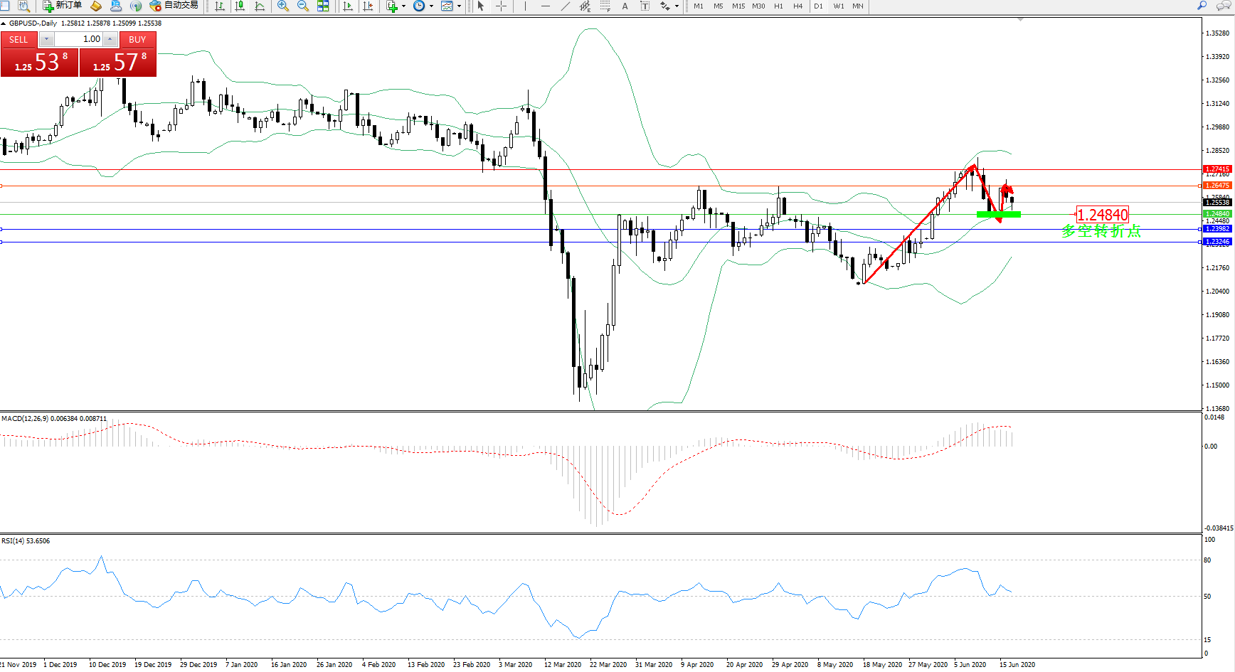 交易策略:1.24840上方看涨,目标1.26475、1.27415