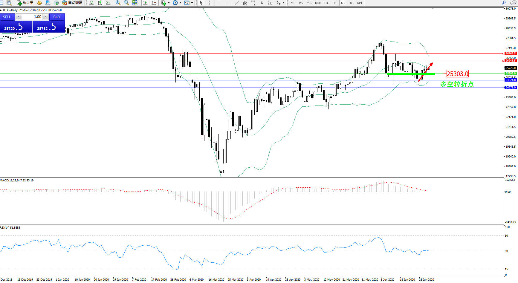 交易策略:25303上方看涨,目标26243、26768