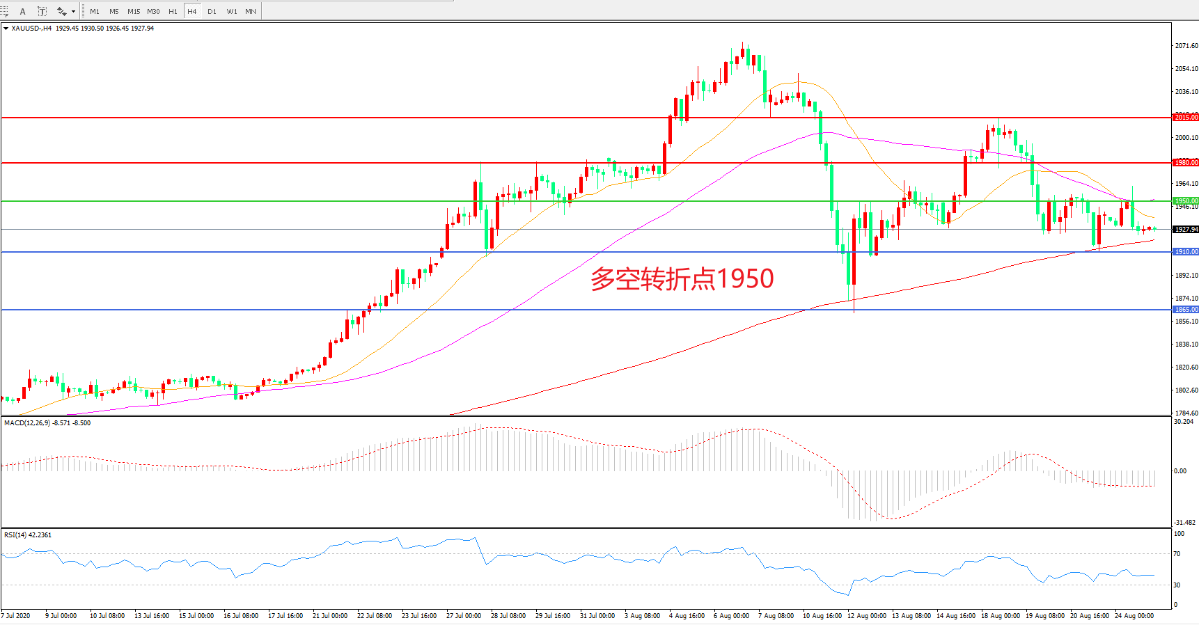 周一(8月24日),血清疗法获FDA批准及特朗普推动新冠疫苗在大选前问世等利好消息提振了市场上的风险情绪,美元指数大幅反弹,现货黄金受到打压,自日内高点跌逾30美金,收报1930美元/盎司。