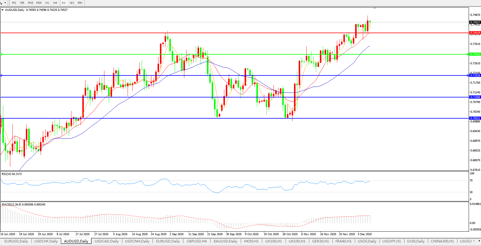 交易策略:0.7300上方看涨,目标0.7400、0.7500