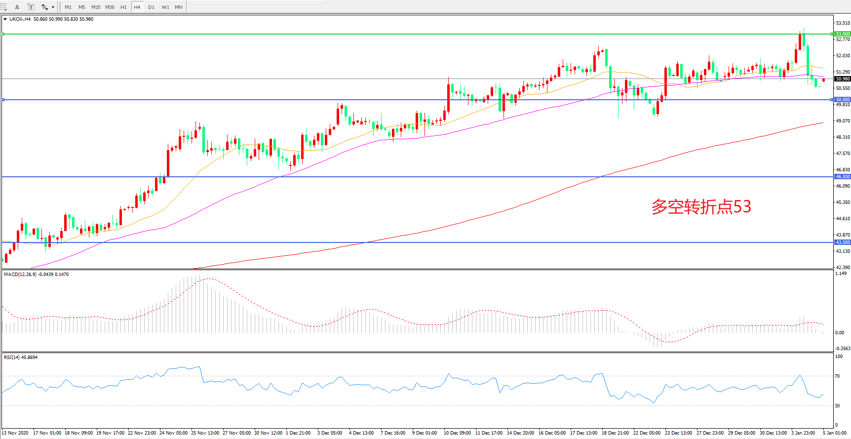 交易策略: 在53.00之下看跌,目标50.00      46.50