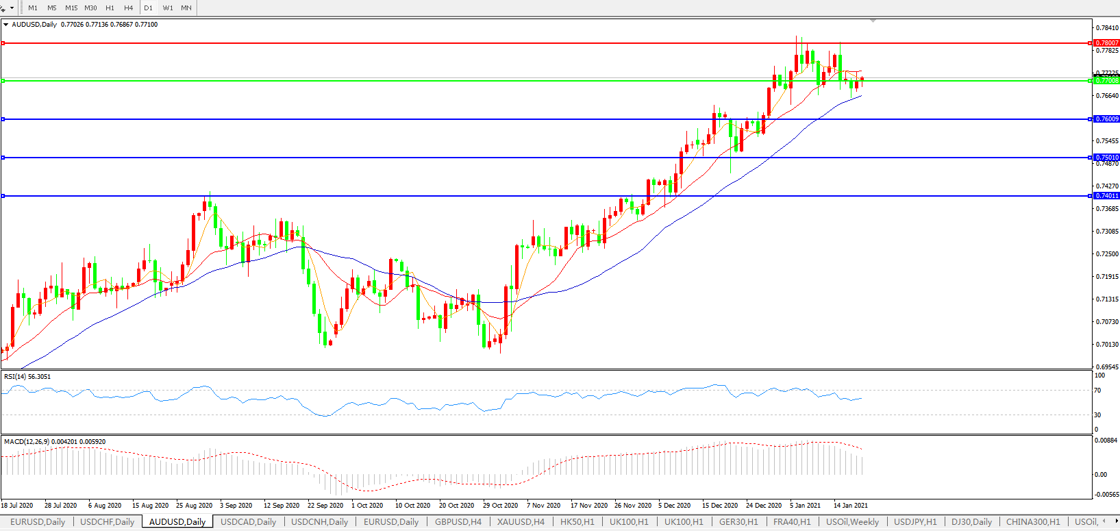 备选策略:0.7700上方看涨,目标0.7800、0.7900