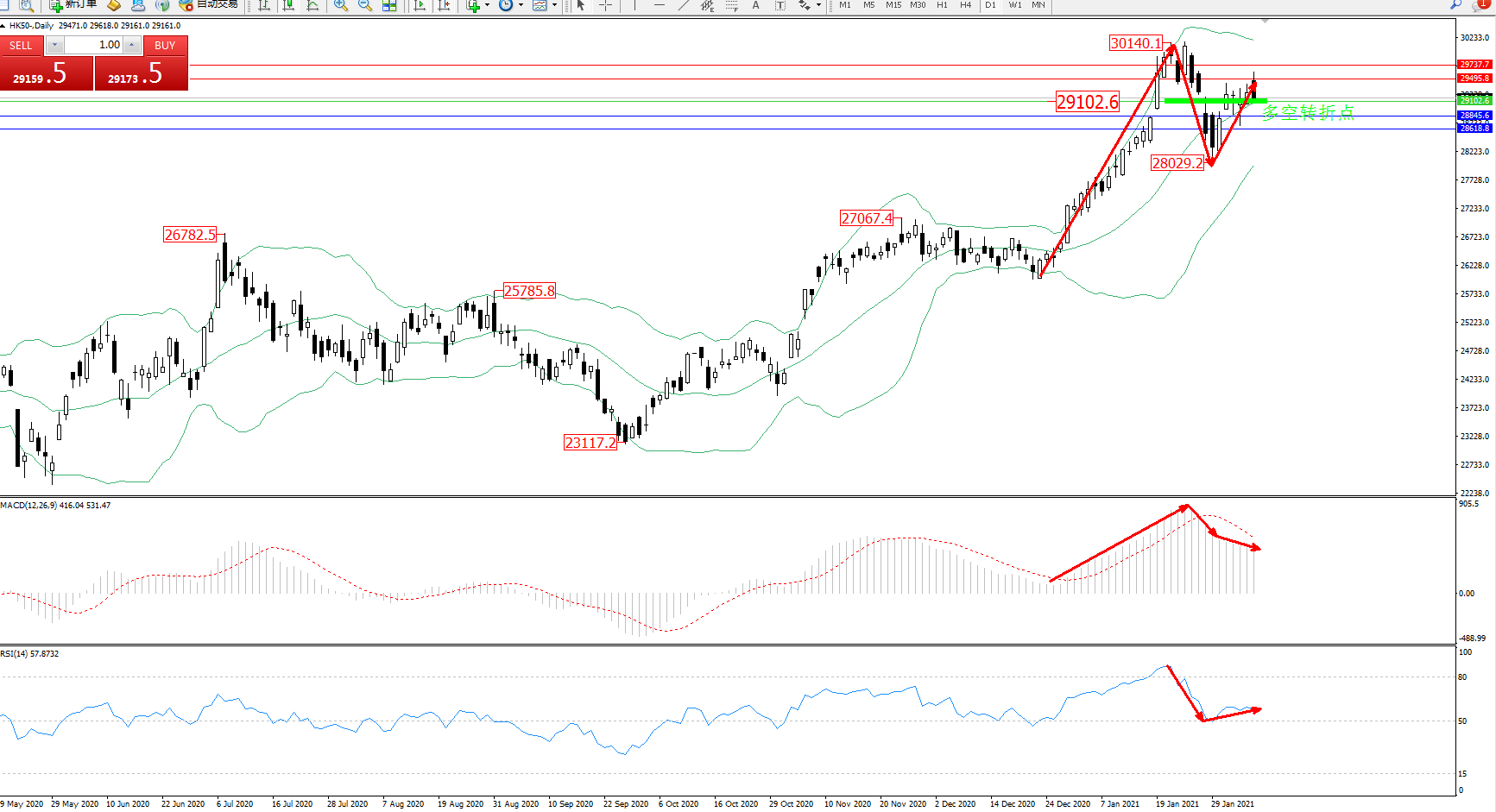 技术点评:多头动力延续布林带指标通道中上轨区间持续震荡上扬至30140位置节点后遇阻开始急速回撤下行,抵达28029位置得到支撑后再度反转向上拉升上扬,处于布林带指标中轨上方震荡数日之久,多空动力短期处于焦灼状态,布林带指标呈收口走势持续中,MACD指标处于多头区域高位震荡回撤后开始走平,RSI指标处于多头区域高位回撤至50均衡线附近节点后得到支撑反转上行中;