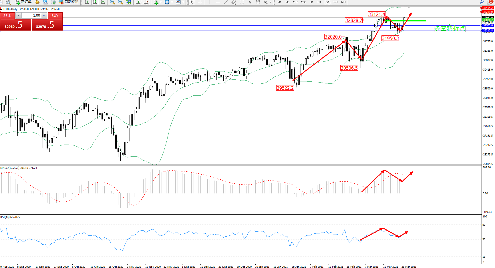技术点评:多头动力延续布林带指标通道内持续震荡上扬,高位抵达33121位置后遇阻回撤,抵达31950位置得到支撑多头动力伺机入场反转上扬,多头不断向上拉升,布林带指标呈张口走势后开始收口向上移动,MACD指标处于多头区域高位整理平移,RSI指标处于多头区域高位弱势震荡回撤后开始反转上移;