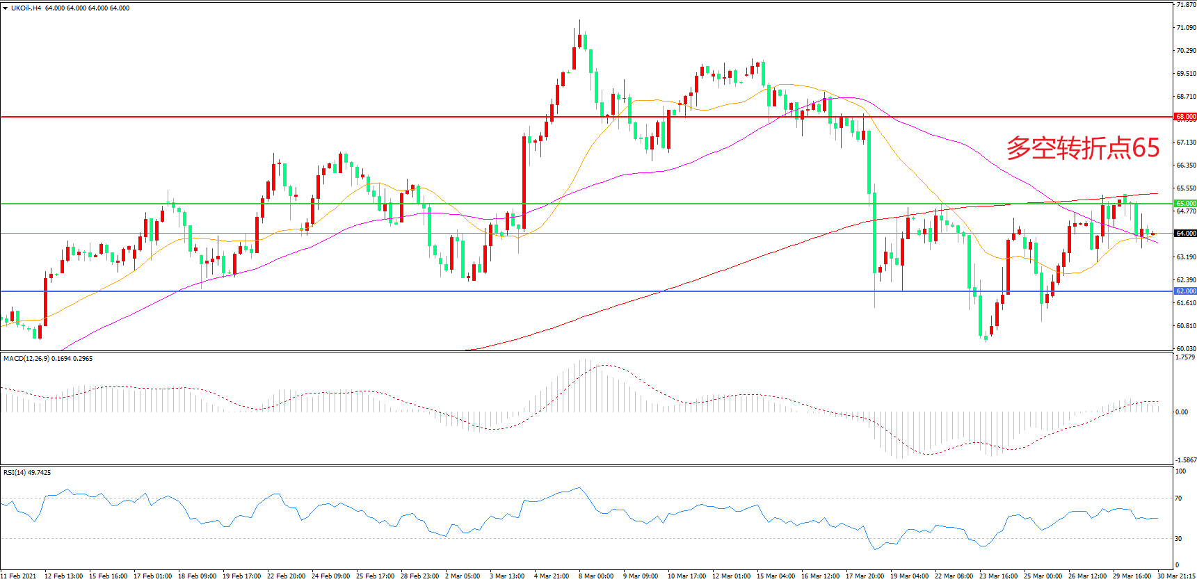 4小时图看,油价触碰65美元后再度回落,短期走势陷入震荡,65美元成为上方阻力,62美元形成下方支撑,MACD红柱缩短,RSI指标走平,日内延续震荡概率较大。
