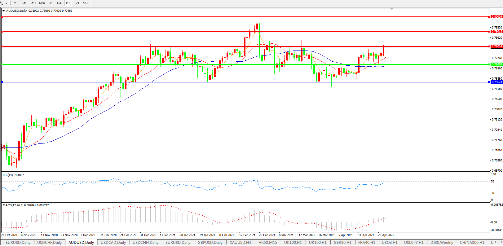 交易策略:0.7680上方看涨,目标0.7800、0.7900