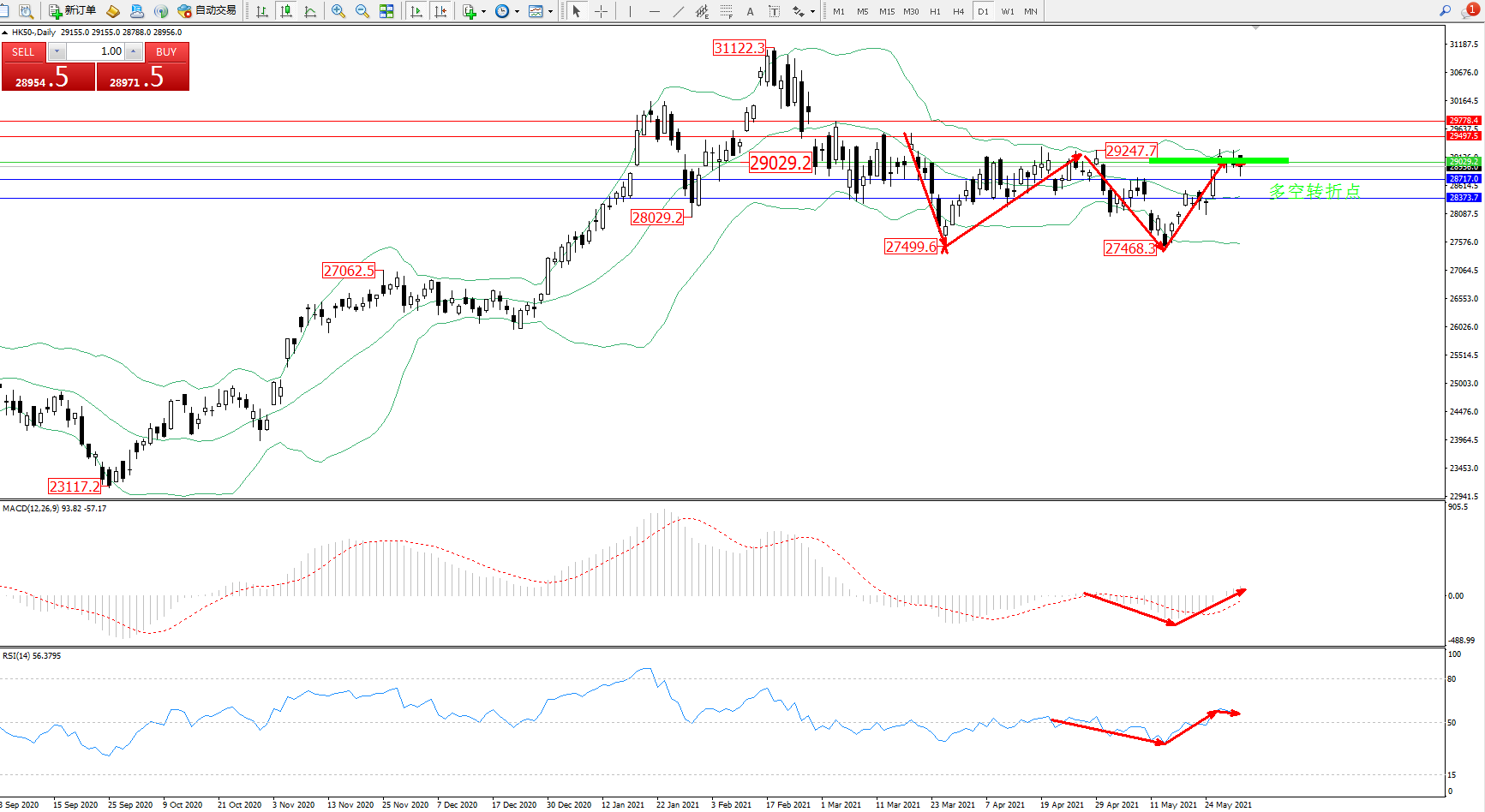 香港恒生指数5月31日(周一)收盘上涨27.39点,涨幅0.09%,报29151.8点;港股三大指数午后拉升,恒指尾盘转涨。恒生科技指数涨1.84%报8104点。生物医药股全线大涨,康方生物等多股创历史新高;大型科技股美团持续拉升,大幅收涨近11%,网易涨超4%,腾讯涨3%,小米涨超2%;午后受三孩生育政策刺激,好孩子国际暴涨超30%,受疫情影响的航空股、石油股、濠赌股全天疲弱。今日大市成交额为1522亿港元,南下资金净流入15.33亿港元。南下资金今日净卖出9.48亿港元。中国移动、友邦保险、中国飞鹤分别遭净卖出8.54亿港元、3.17亿港元、2.68亿港元。净买入方面,美团-W、腾讯控股、思摩尔国际分别获净买入14.37亿港元、7.9亿港元、4.63亿港元。香港特区政府卫生署卫生防护中心31日公布,截至当日零时零分,香港新增4例输入性新冠肺炎确诊病例。截止到目前,香港累计新冠肺炎确诊病例11841例。香港特区政府:《2021年收入(印花税)条例草案》的二读辩论将恢复。法案若获得议员支持及通过二读,将会交付全体委员会。法‍案经全体委员会审议后,若全体委员会的报告获立法会采纳,法案将进行三读。