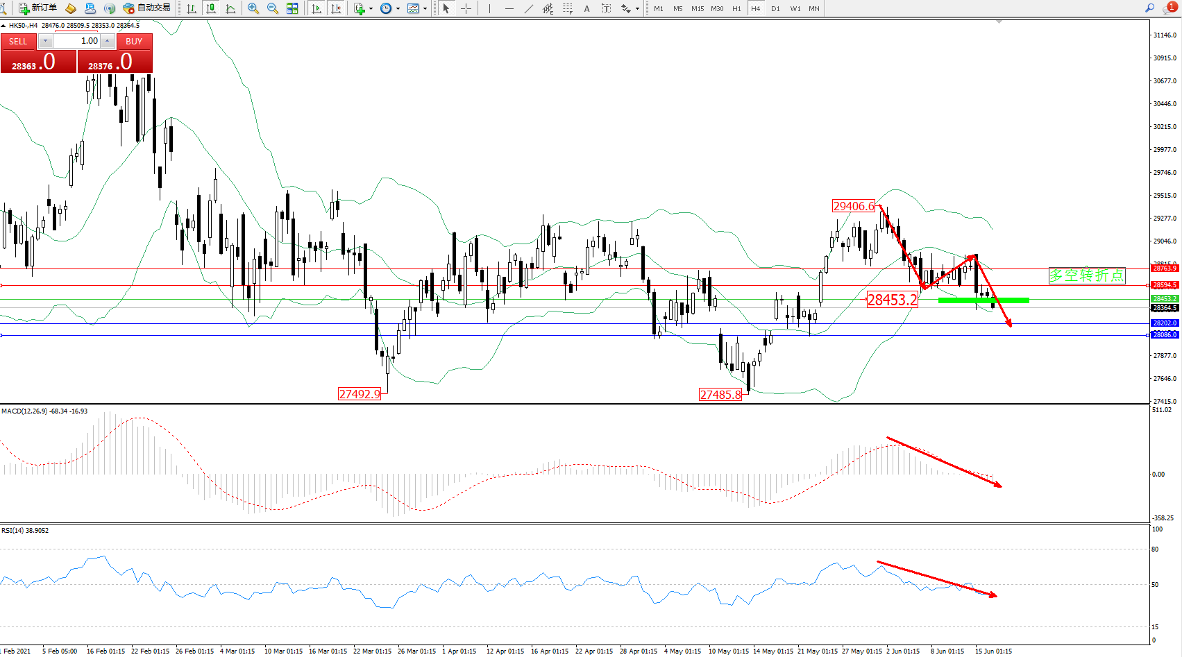 恒指HK50 ——4小时K线图显示: