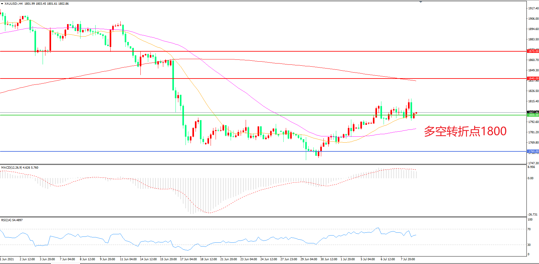 交易策略:  在1800.00之上看涨,目标1840.00        1870.00