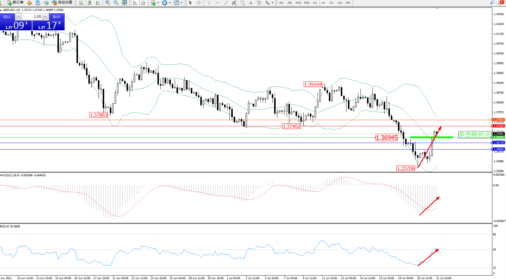 交易策略:1.36945上方看涨,目标1.37402、1.37655