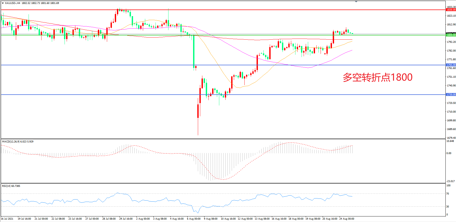 交易策略:  在1800.00之上看涨,目标1830.00       1860.00
