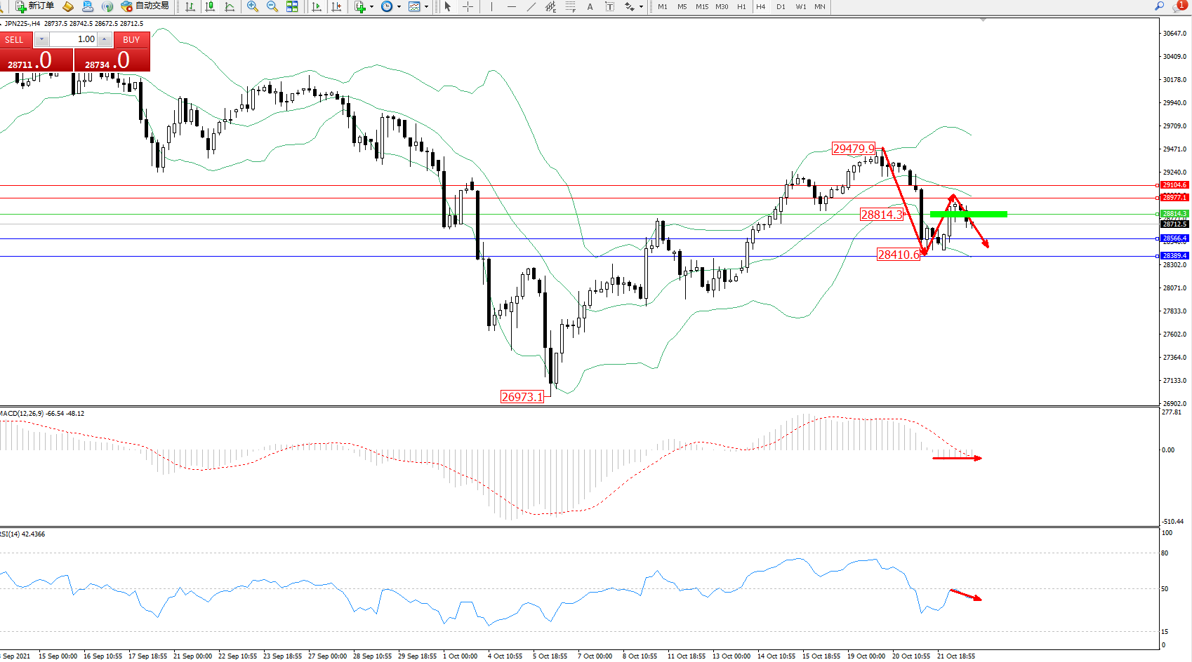 技术点评:高位空头动力维持布林带指标通道中下轨区间持续震荡下行,低位抵达28410位置得到短暂支撑后回升,但下行态势良好,短期未有进一步反转迹象,布林带指标呈张口走势后开始收口向下移动,MACD指标处于0轴线下方空头区域维持整理平移,RSI指标处于50均衡线下方窄幅震荡向下移动;