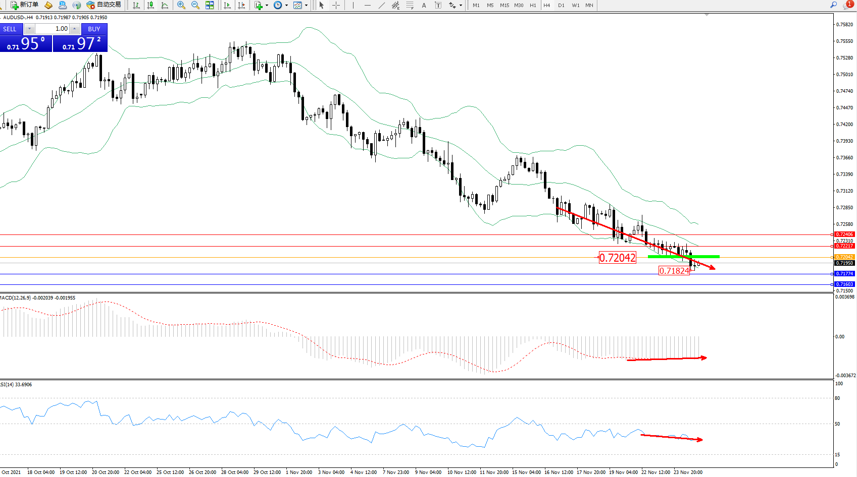 备选策略:0.72042下方看跌,目标0.71774、0.71603