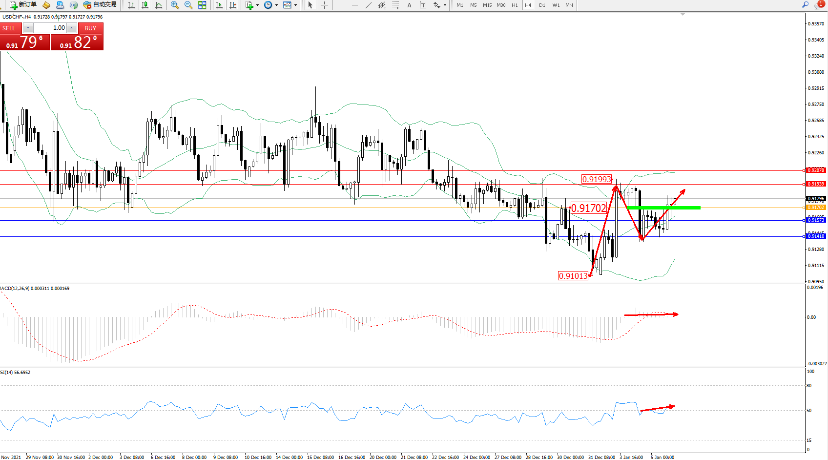 交易策略:0.91702上方看涨,目标0.91939、0.92078