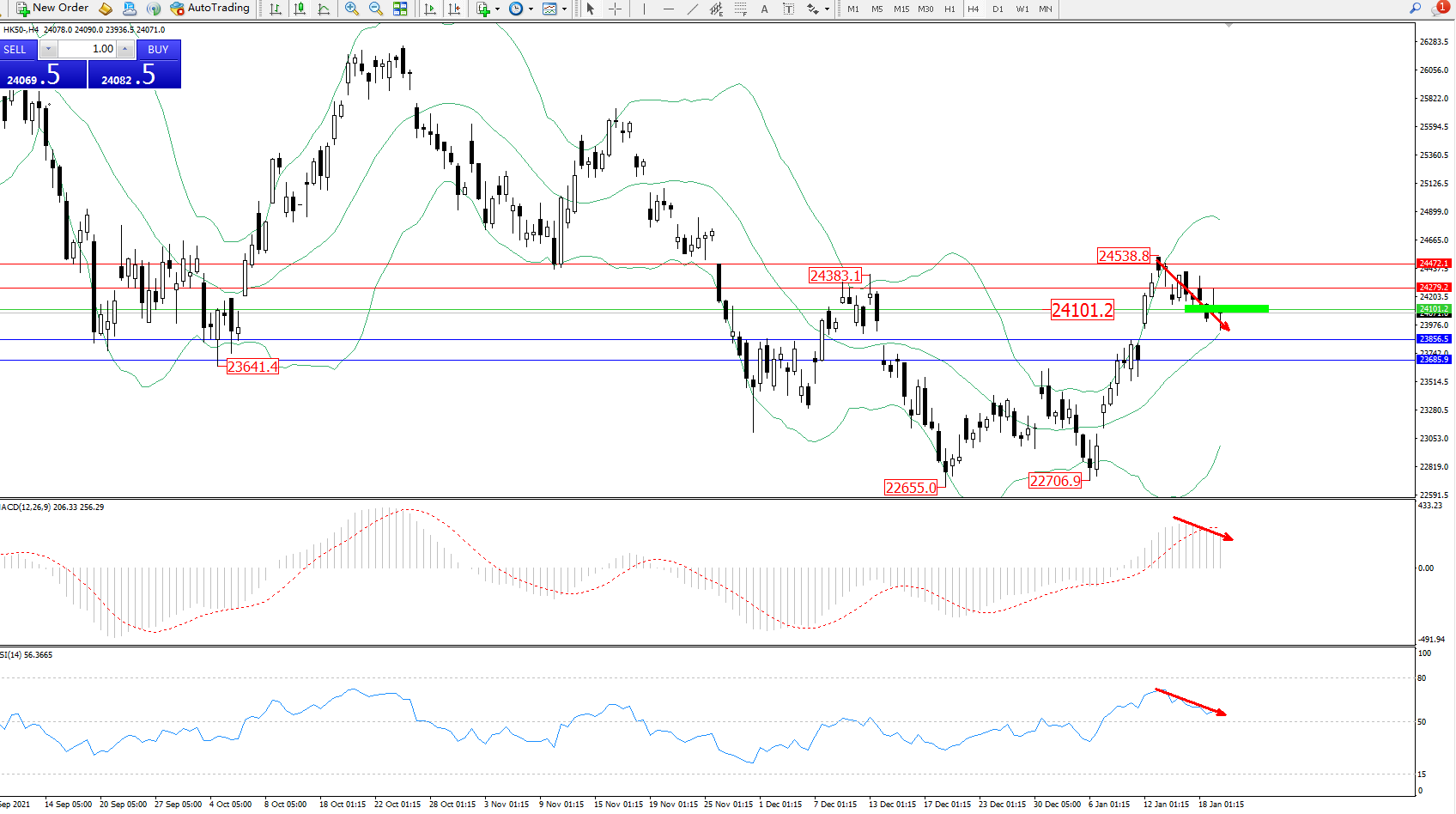 恒指HK50 ——4小时K线图显示: