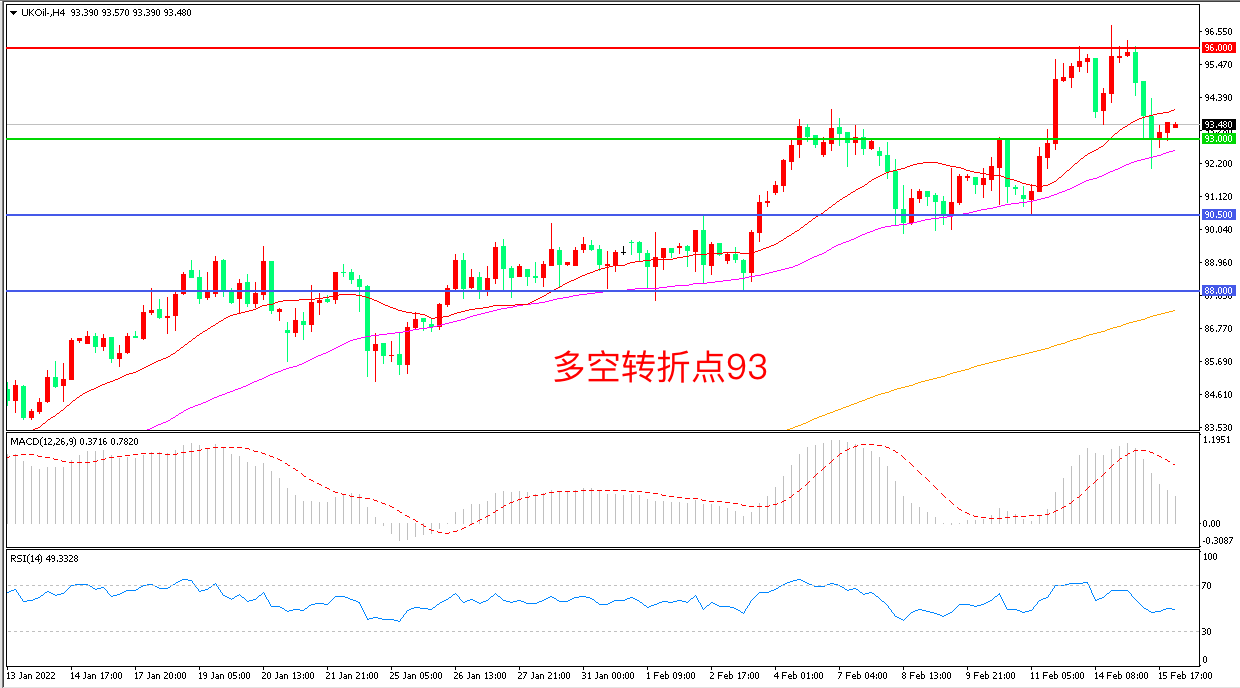 4小时图看,油价自高位长阴下破,上行趋势暂缓, 96美元成为阻力,93美元成为多空分水岭,MACD红柱缩短,RSI指标走平,日内震荡上行概率较大。