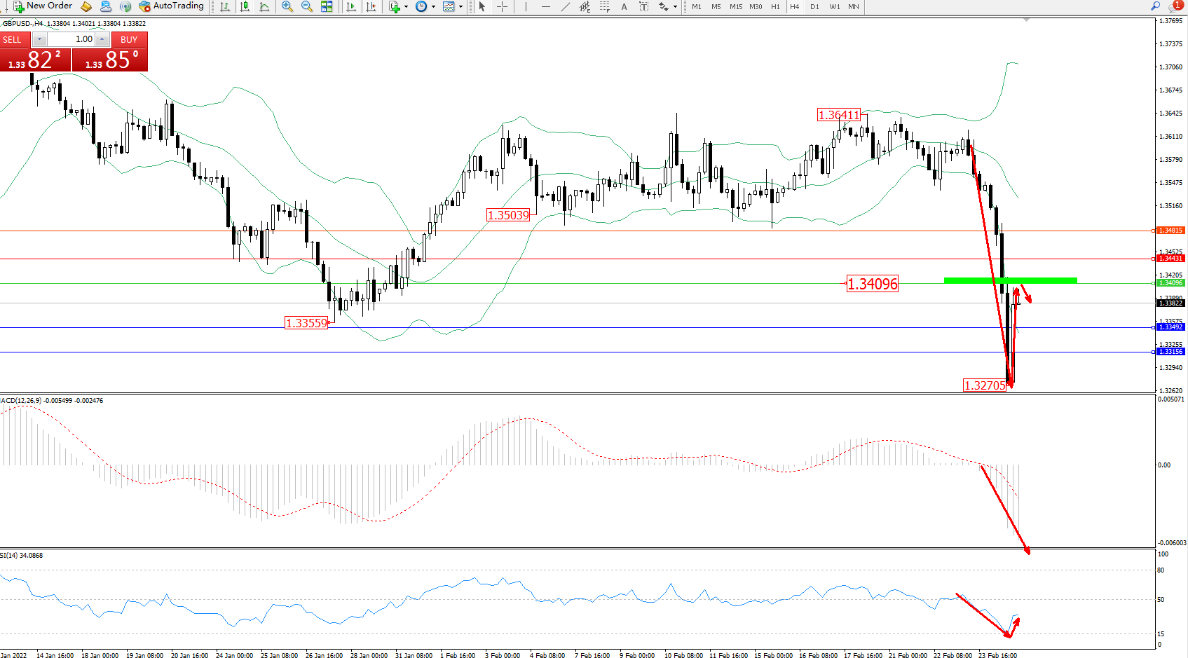 交易策略:1.34096下方看跌,目标1.33492、1.33156