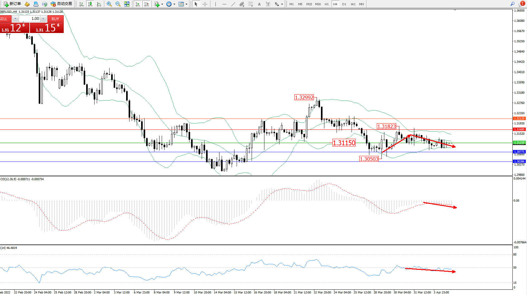 交易策略:1.31150下方看跌,目标1.30775、1.30386