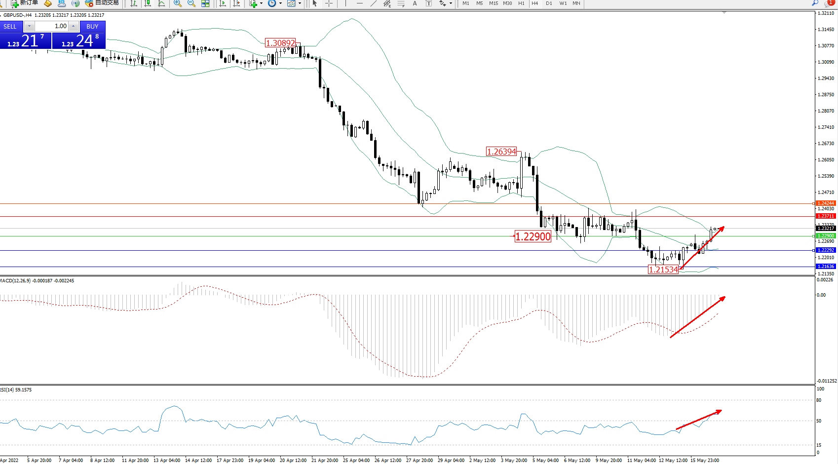 交易策略:1.22900上方看涨,目标1.23711、1.24244