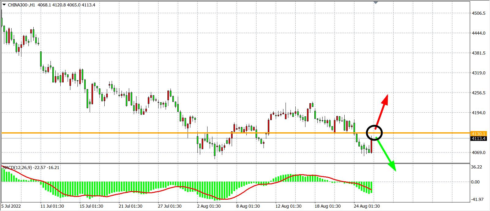 1小时图看,沪深300低位反攻,但始终受压制于4130之下,阻力位再度得到确认,MACD于零轴之下量能开始缩小,预示行情或进入反弹调整,在未上破4130之前继续看跌,下方目标4050-3970;上破4130看涨,目标4200之上