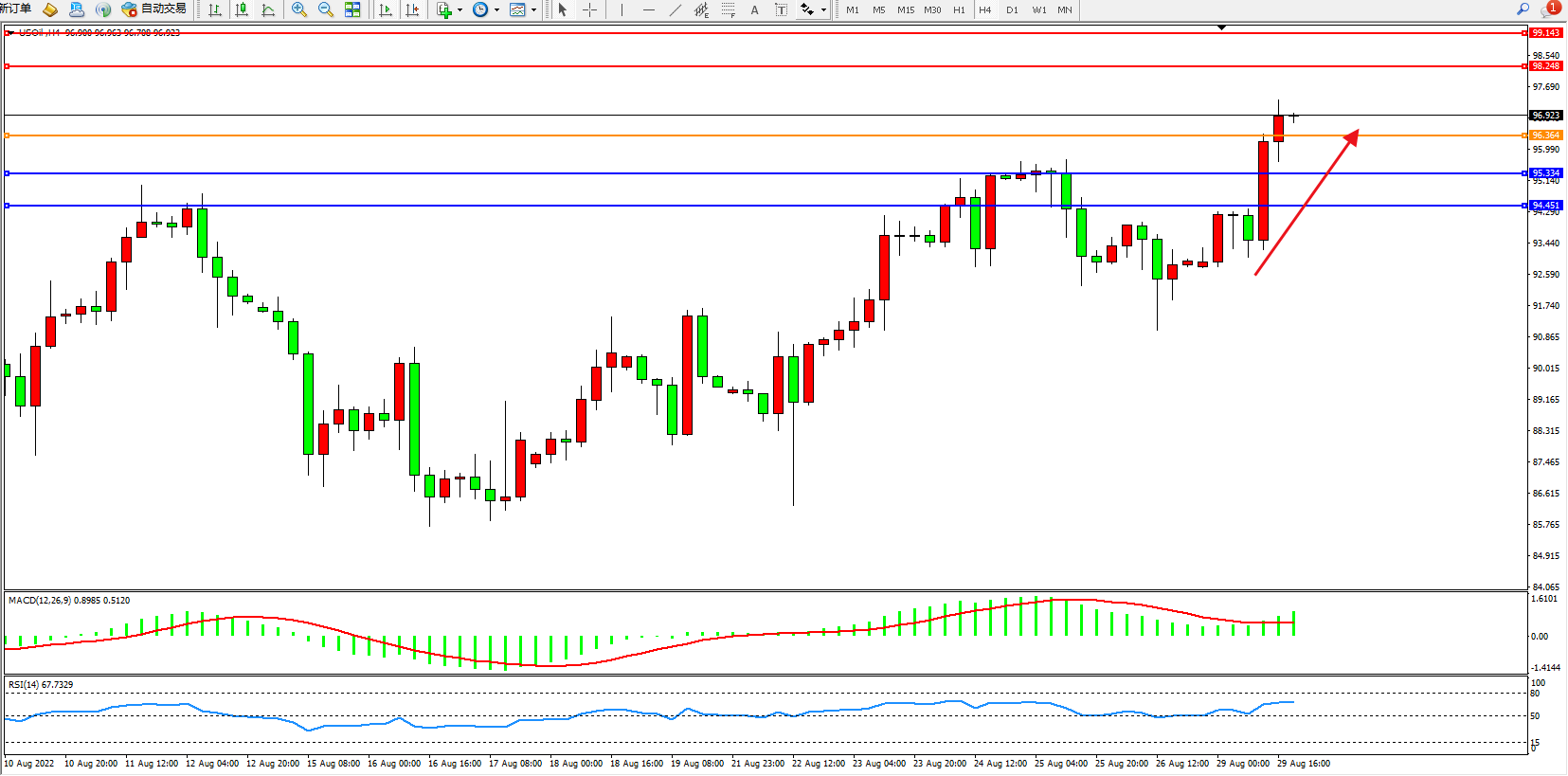 交易策略:96.364上方看涨,目标98.248、99.143