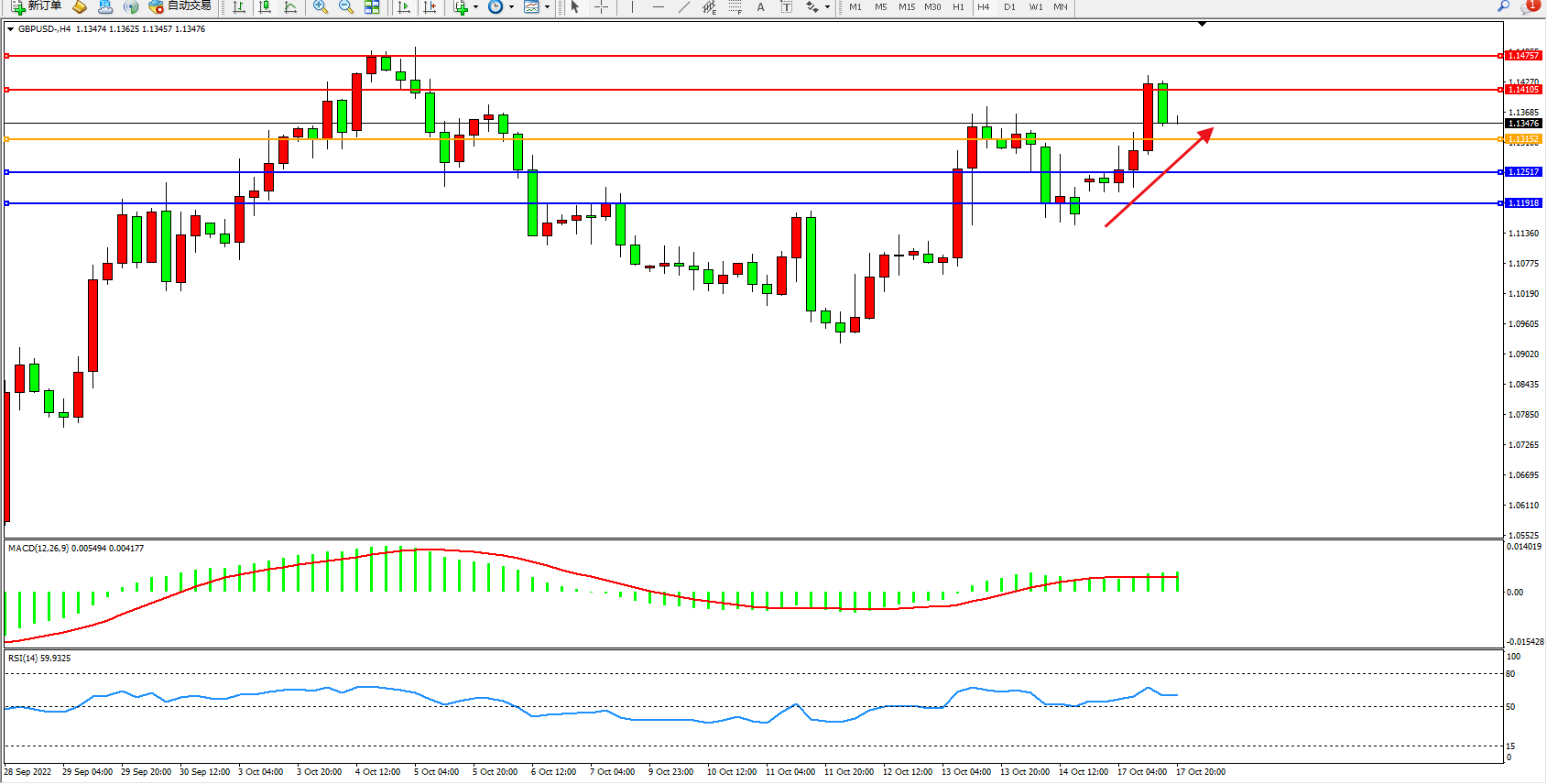 交易策略:1.13152上方看涨,目标1.14105、1.14757