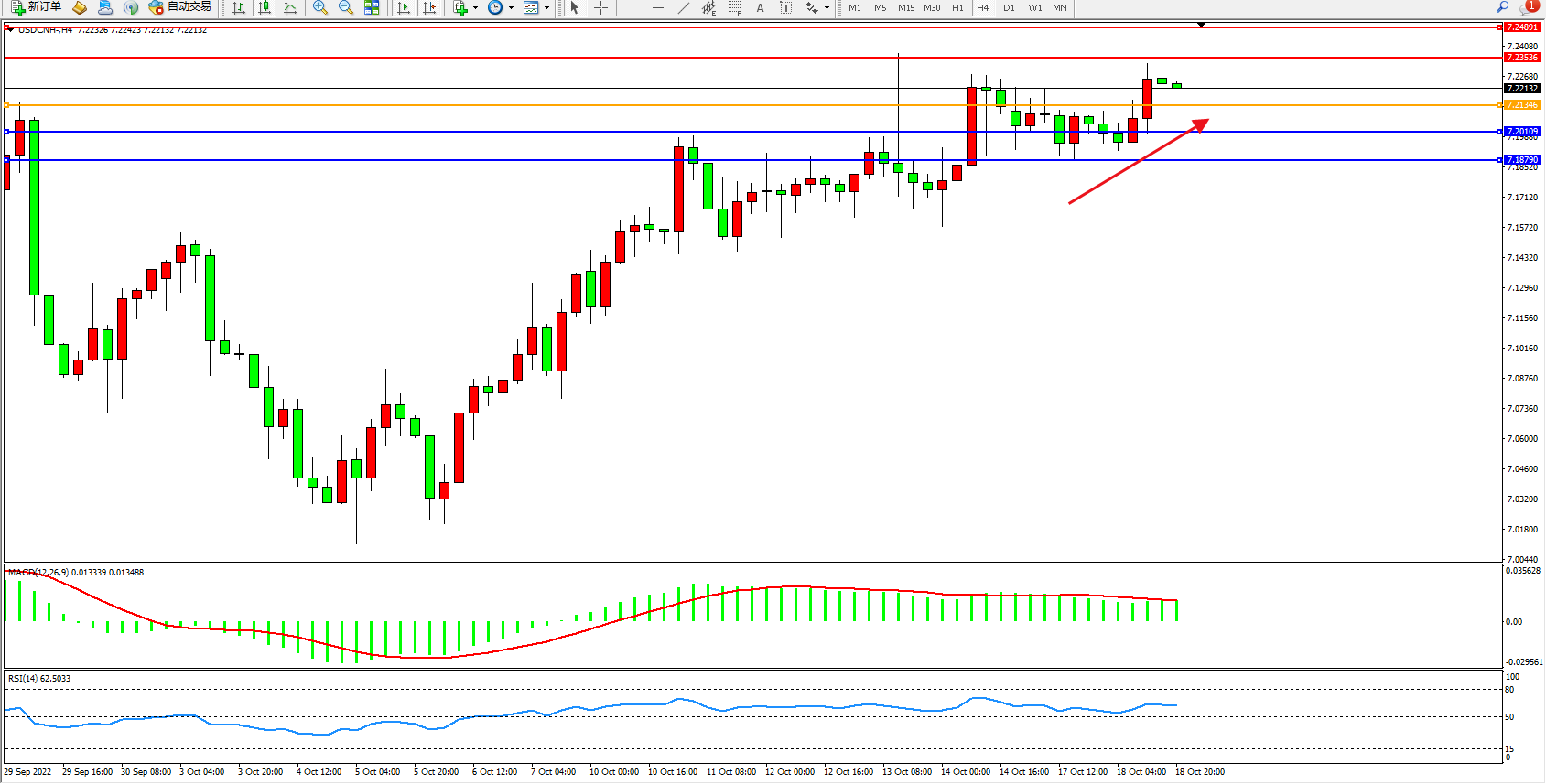 美元人民币USDCNH——4小时K线图显示: